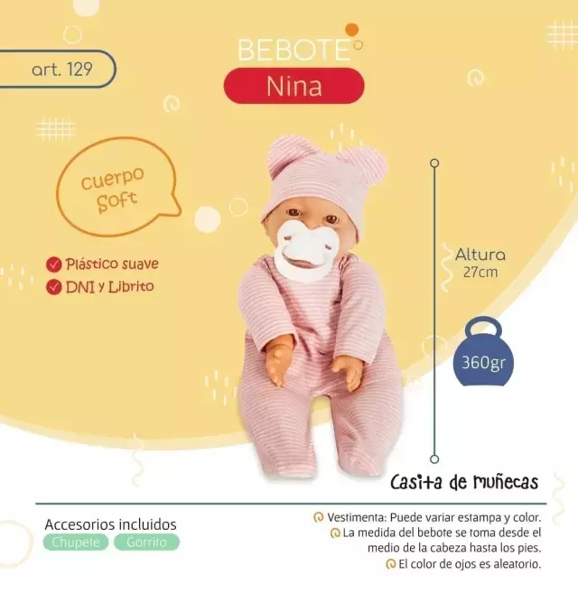 Bebote apariencia real 27cm. Tiene manos, pies y cabeza en plastisol y cuerpo relleno de vellón siliconado. Viene con osito con gorro con orjetas y chupete de palito. Trae DNI y librito de crecimiento.