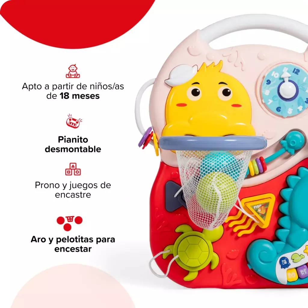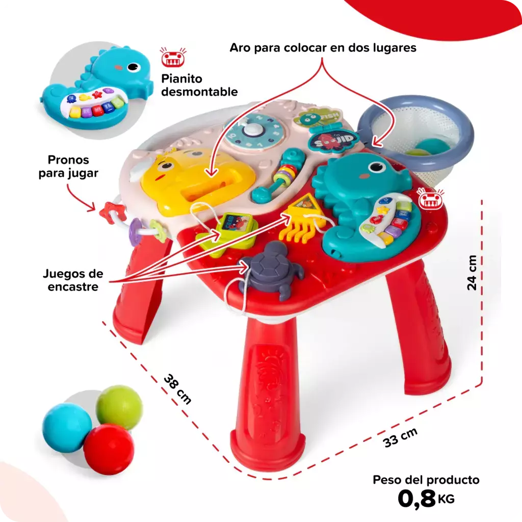 Incluye: Stickers, mesa desarmada, 3 pelotitas sonajeras, piano (pilas no incluidas), pies de mesa, aro con red, y manual de usuario.