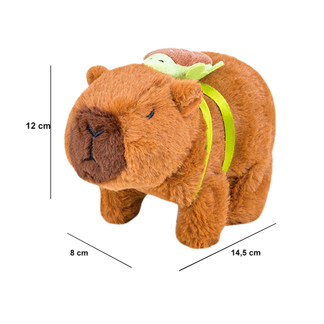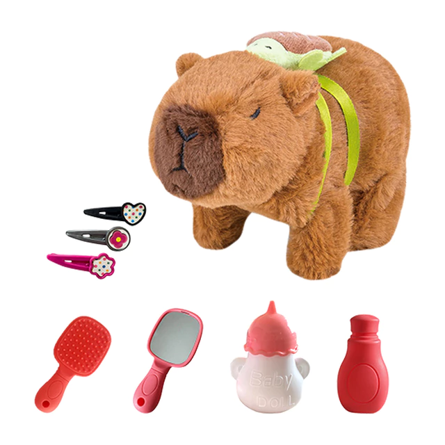 Incluye: 1 Capibara de peluche, cepillo para peinar, espejito de mano, biberón de juguete, shampoo de juguete y broches para el pelo