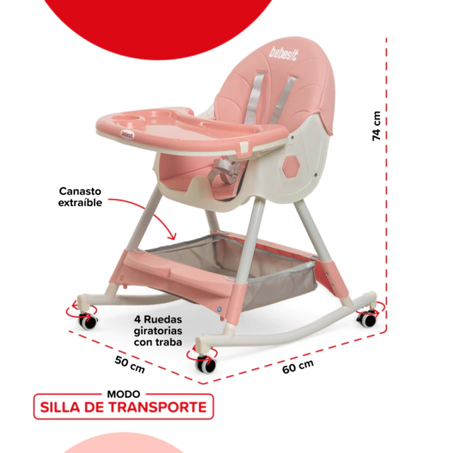 La Silla de Comer 4 en 1 Bebesit es una solución práctica y versátil para acompañar al bebé en cada etapa. Su estructura multifunción se adapta como silla alta, baja, mecedora o silla de transporte, brindando comodidad, seguridad y practicidad en todo momento.
